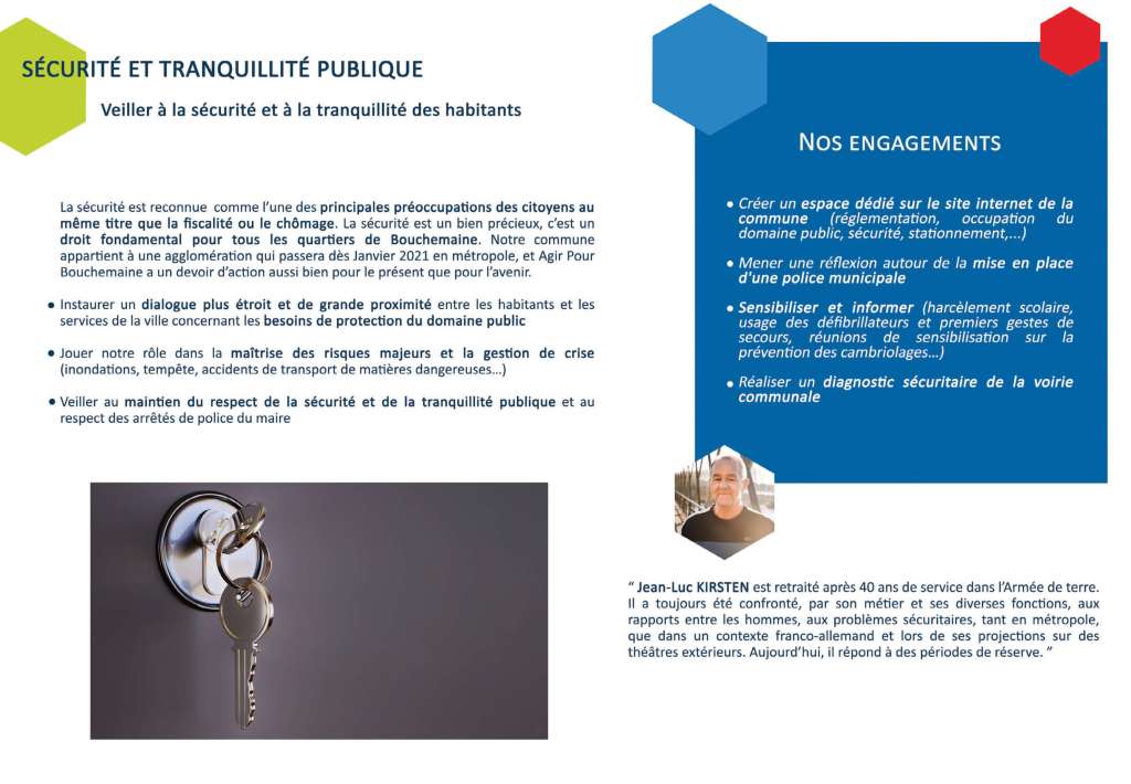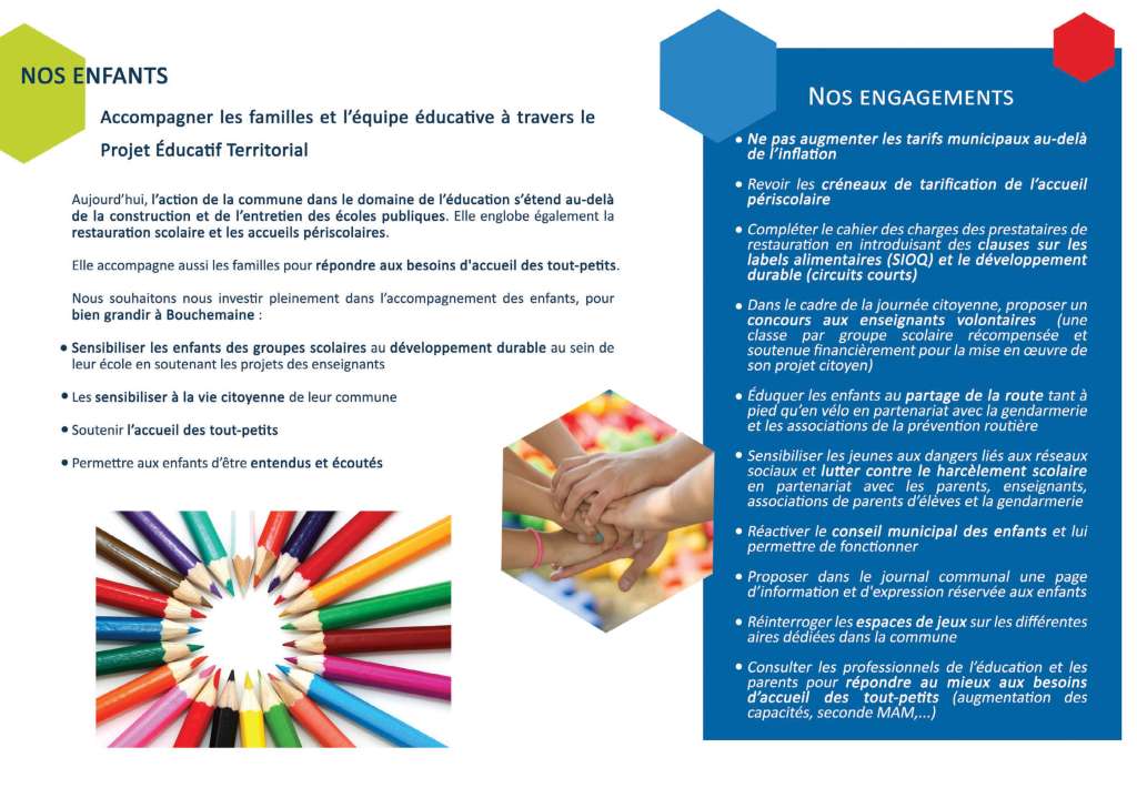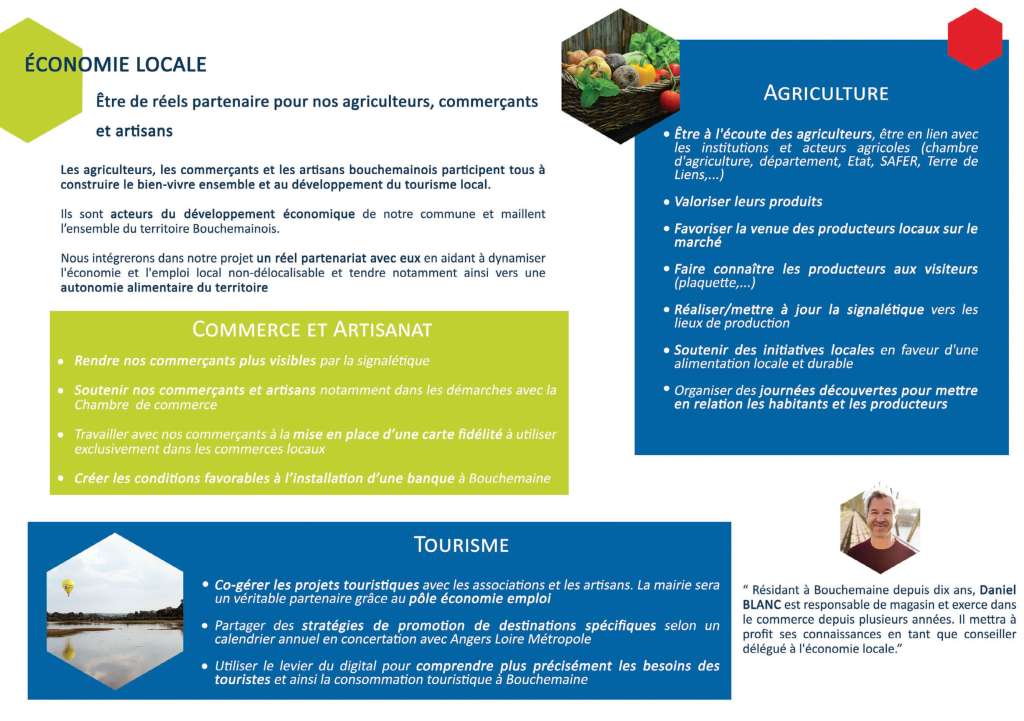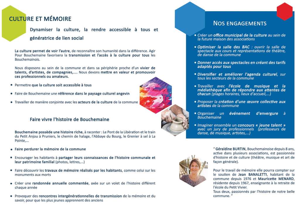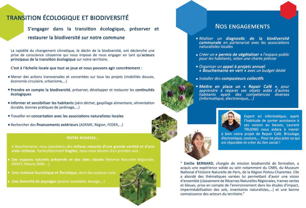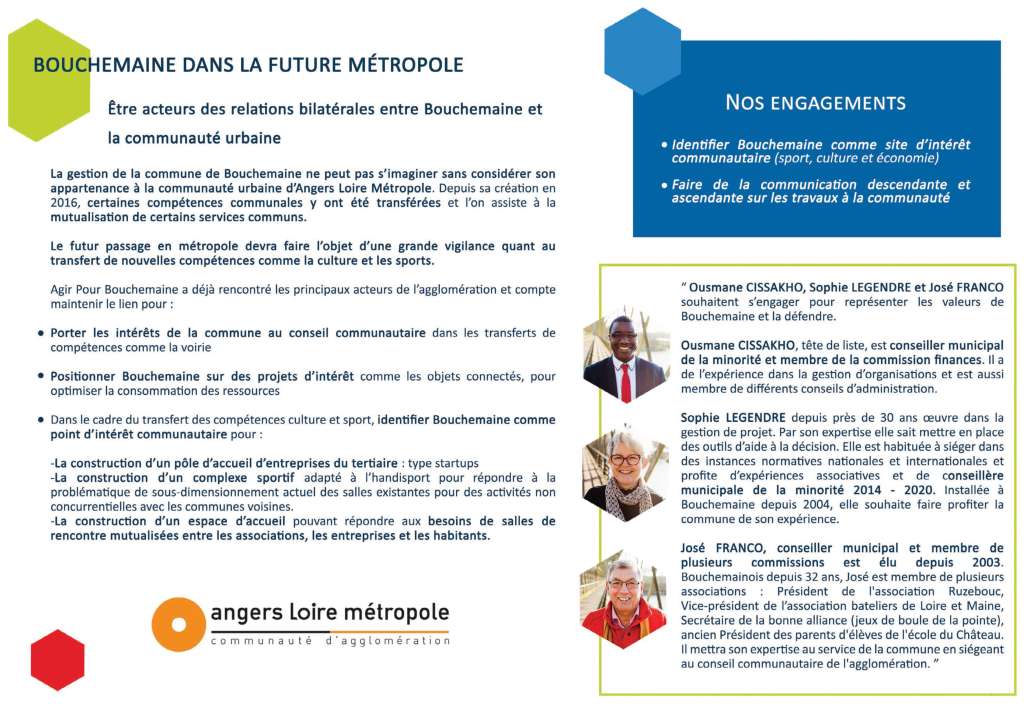 Notre seul objectif est d’être à votre service car pour nous, s’engager c’est donner le meilleur de soi-même sans jamais attendre en retour récompense ni même reconnaissance. C’est être ambitieux pour Bouchemaine et humble pour soi-même. C’est se donner pleinement, entièrement à la cause que l’on a choisie, et nous avons choisi Bouchemaine.